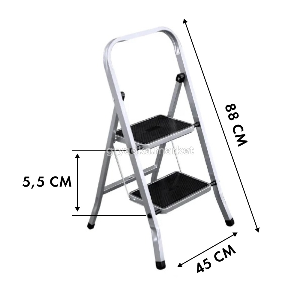 Скобы ступеней изготовлены из стальной проволоки с насечками, имеют защитно-декоративное цинковое покрытие. Размеры сечения конструктивных элементов специально подобраны таким образом, чтобы свободно выдерживать рабочие нагрузки. Для предотвращения скольжения при работе лестница-стремянка комплектуется противоскользящими пластмассовыми накладками.