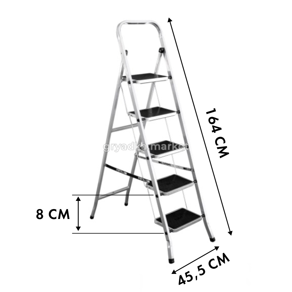 Скобы ступеней изготовлены из стальной проволоки с насечками, имеют защитно-декоративное цинковое покрытие. Размеры сечения конструктивных элементов специально подобраны таким образом, чтобы свободно выдерживать рабочие нагрузки. Для предотвращения скольжения при работе лестница-стремянка комплектуется противоскользящими пластмассовыми накладками.