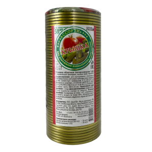 Крышка изготовлена из высококачественной белой жести толщиной 0,18 мм, что обеспечивает оптимальное сочетание прочности и пластичности при закатке. Внутренняя поверхность покрыта пищевым лаком, безопасным для контакта с продуктами питания и не влияющим на вкус и качество заготовок.