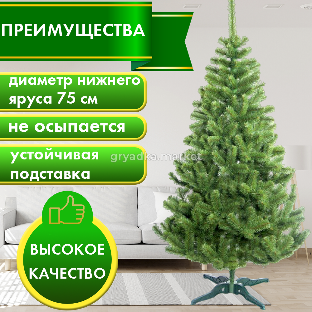 Ель имеет прочную пластиковую подставку, что обеспечивает ей стабильность и легкость в установке.