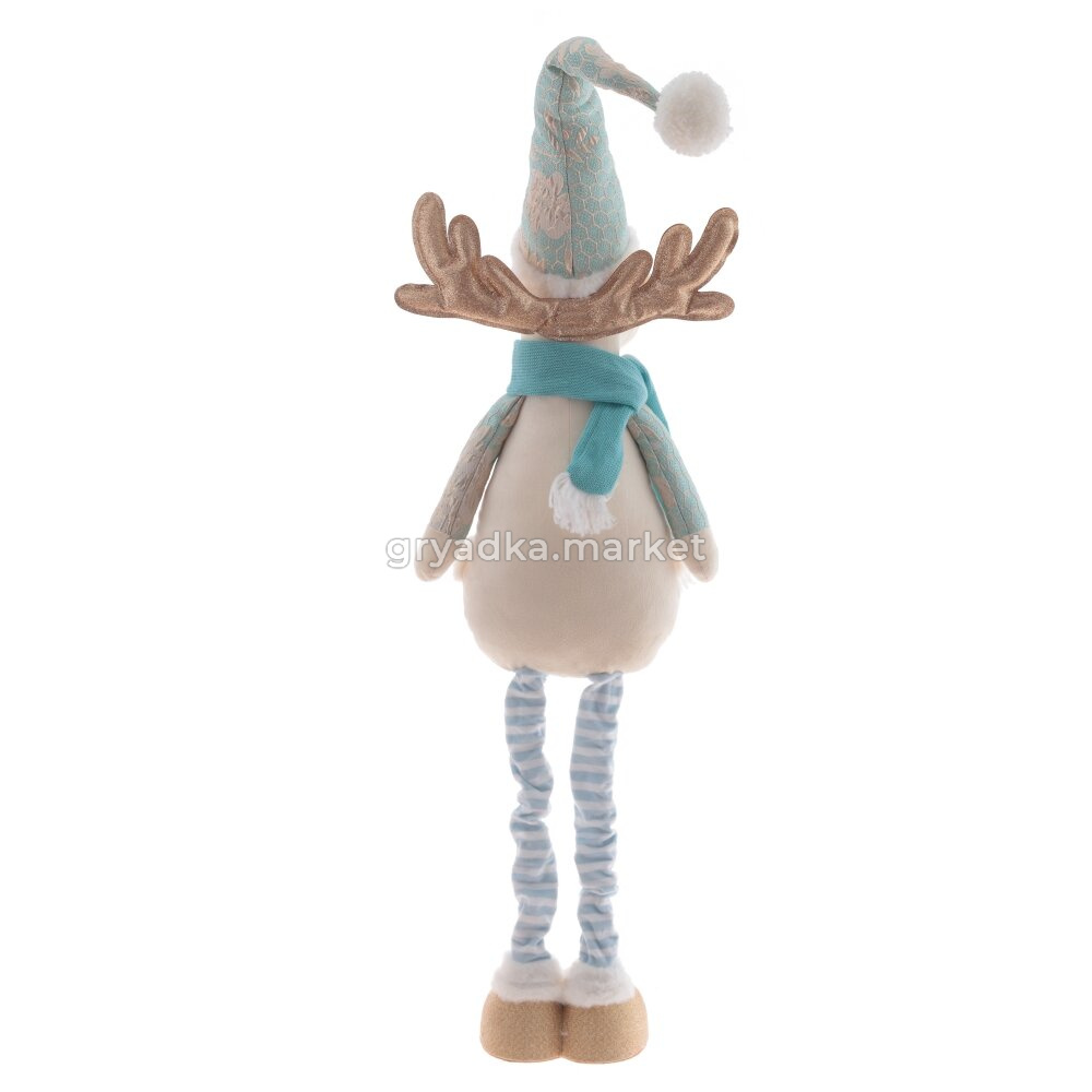 Эта интерьерная игрушка высотой от 51 до 100 см представляет собой белого оленя с золотыми рогами, одетого в красивый голубой зимний наряд. Длинный колпак с проволокой внутри позволяет придавать ему разные формы, добавляя оленю еще большую живость.Телескопические ножки позволяют изменять высоту игрушки и гармонично вписать ее в любой интерьер. Золотые копыта гармонично сочетаются с золотыми рогами и рисунком на одежде, а голубой шарф дополняет образ и придает оленю особый шарм.