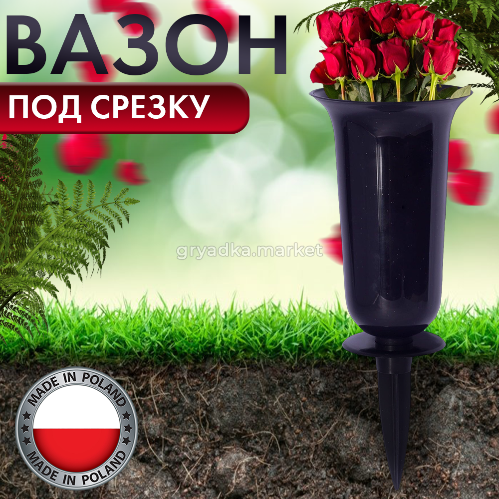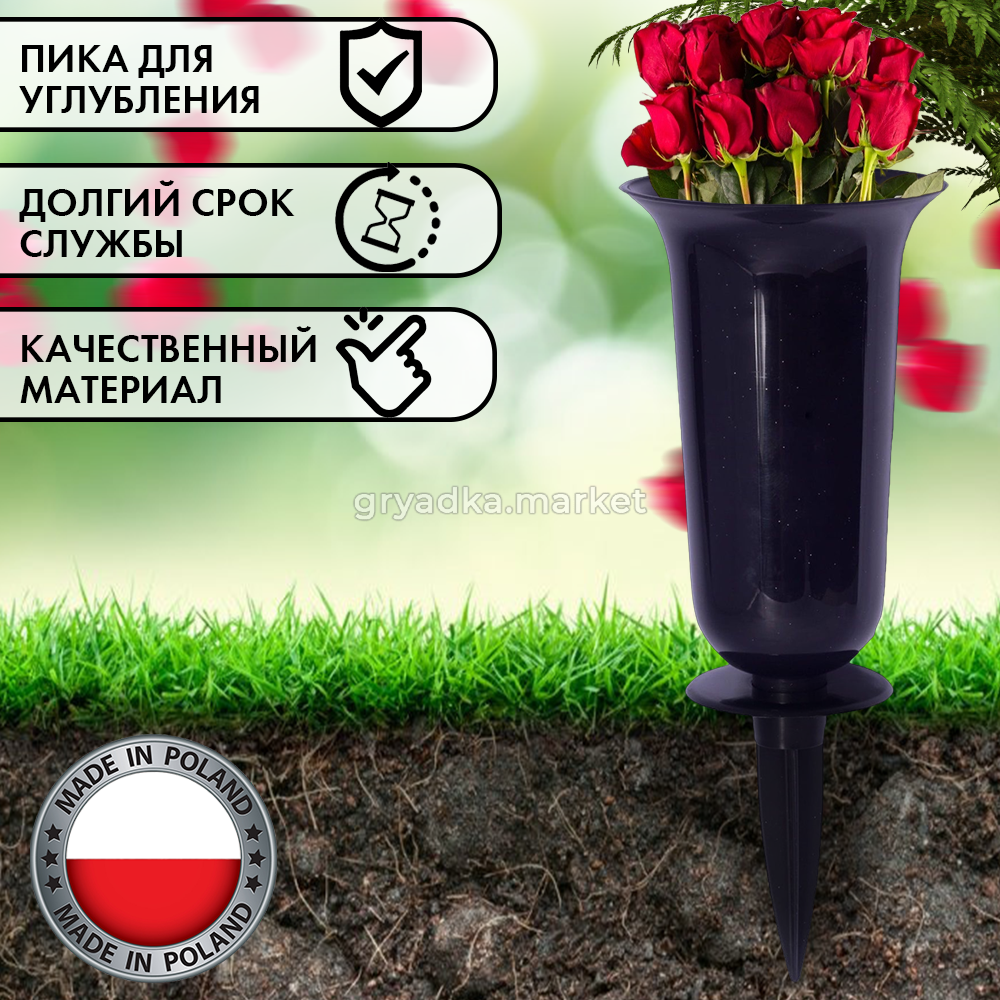Пластиковая ваза для свежесрезанных и искусственных цветов с колышком предназначена для использования на кладбищах в качестве ритуального элемента, в саду, на даче и в частном доме для установки цветов или других растений. Она имеет прочный корпус из пластика, который морозостойкий, не боится влаги и не коррозирует. Колышек предназначен для укрепления в грунте и обеспечивает надежное крепление вазы и ее содержимого на месте даже во время сильного ветра. Благодаря своему дизайну ваза может быть использована в качестве декоративного элемента, создать уютную атмосферу на вашем участке.