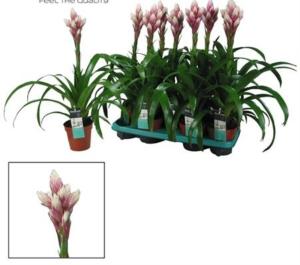 Растение имеет густую зелень, которую формируют глянцевые пластины средней длины, заостренные на концах. Особенной красотой обладают бутоны. Они сформированы в виде чешуек. Основа каждой окрашена в насыщенный розовый цвет, кончик – в белый.