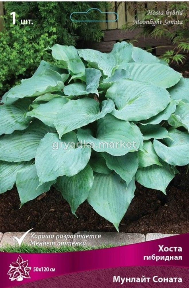 Мунлайт Соната - высота растения 50 см, ширина 120 см. Листья плотные, ребристые, чашевидные, волнистые по краю, сине-зеленые, после - блестящие зеленые, цветки почти белые, ароматные, устойчива к слизням.