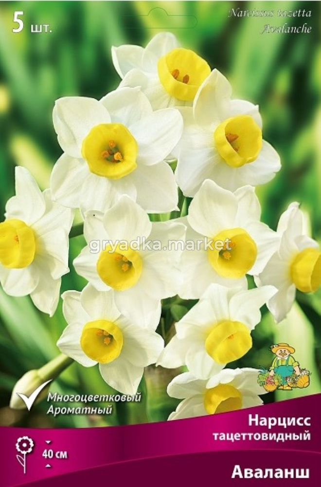 Аваланш - высота растения 40 см. Оригинальный изящный сорт букетного типа. Расцветает гроздьями двухцветных цветов, до 10-ти цветков в одной грозди. Лепестки белые с маленькими ярко-желтыми коронками в виде чашечек. Смотрится очень красиво и живописно. Обладатель престижной награды за садовые заслуги.