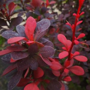 Листья мелкие, в верхней части красно-пурпурные, снизу — темно-зеленые. Осенью преобладают алые оттенки.