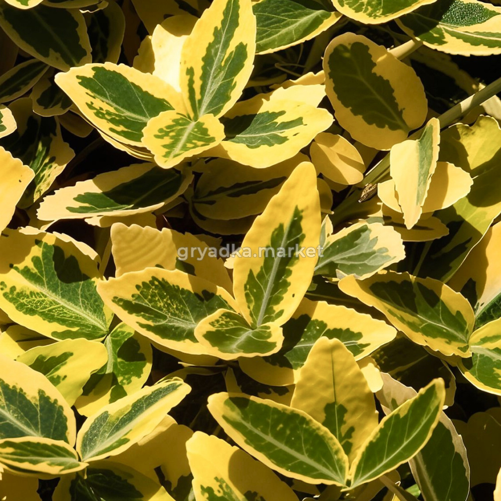 Кожистые, блестящие, эллиптической формы, зеленые с желтой каймой, зимой кайма желтая и розовая, 2-4 см длиной.