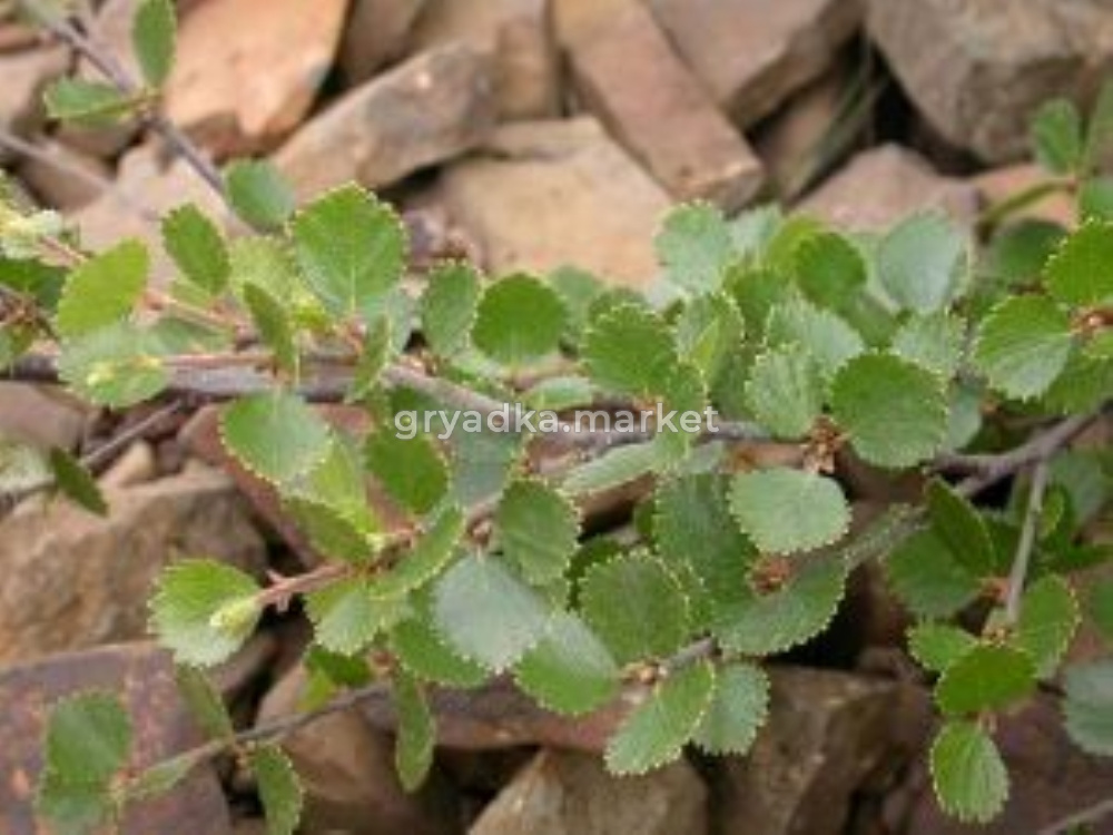 Стелющийся кустарник высотой 0,5-1,2 м с приподнимающимися ветвями в молодом возрасте и стелющимися в старшем. Листья округлые на коротких черешках, с небольшими зубчиками. Побеги темно-коричневые и светло-коричневые более молодые. Корневая система поверхностная, широкая.