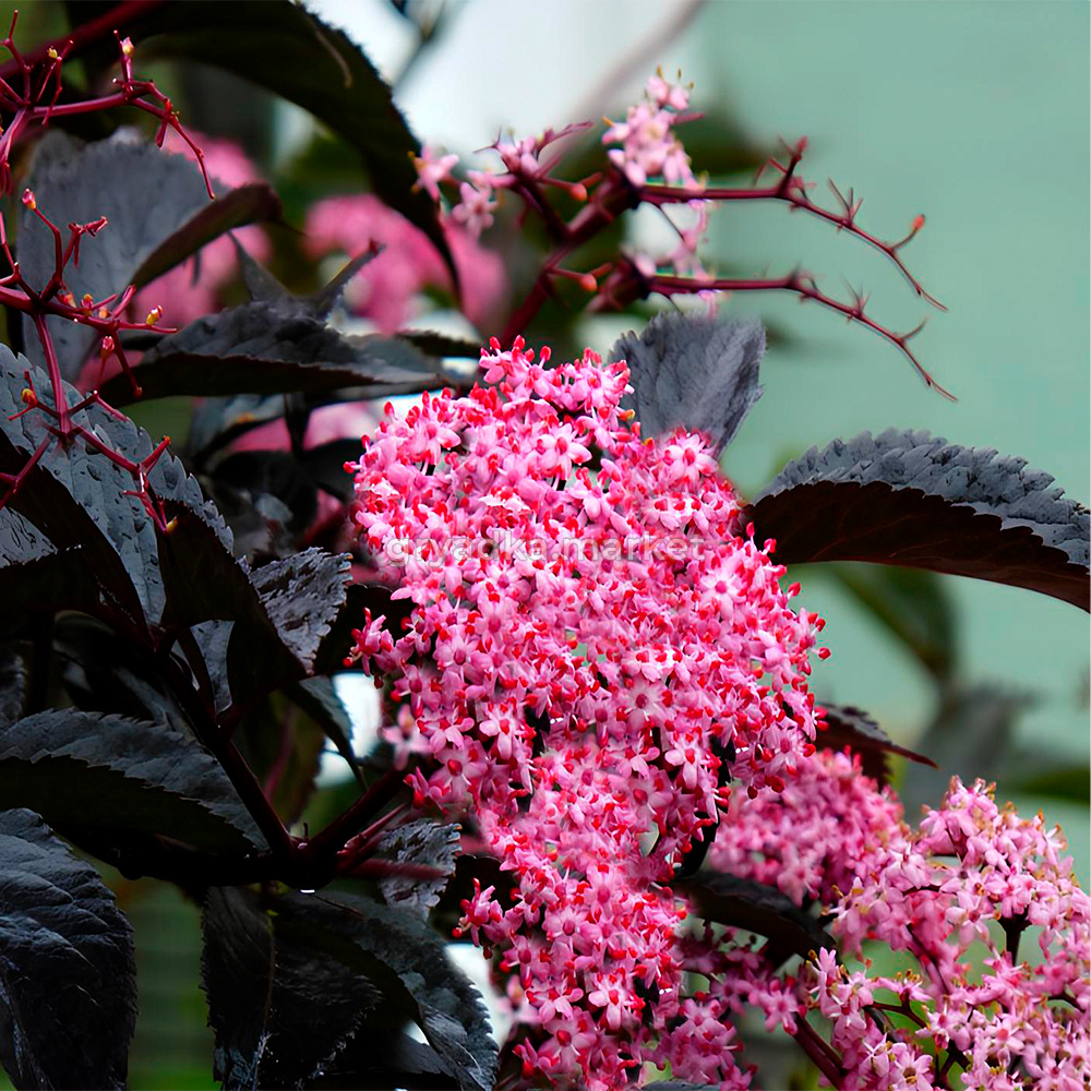 Листья темно-пурпурные, иногда почти черные, блестящие. Цветки розовые, цветет в июне - июле.