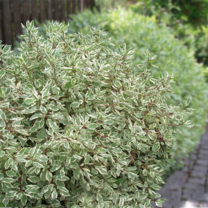 яйцевидные, заостренные листья со слегка морщинистой поверхностью, темно-зеленые с белым кантом и вкраплениями того же колера; осенью превращаются в фиолетовые или красные, сохраняя прежнюю расцветку каймы