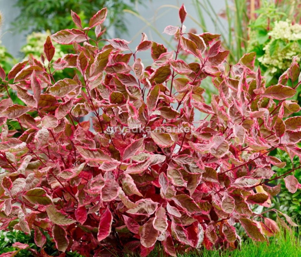 Листья зеленые и белые с розовой каймой весной и в начале лета. С конца лета до осени листья приобретают интенсивно пурпурно-розовый окрас. Побеги красные. Осенний окрас алый с малиново-бордовым оттенком, что придает особый шарм в осеннем саду.