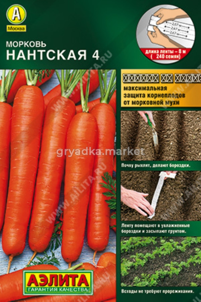 Посев: почву разрыхляют. Ленту помещают в хорошо увлажненные бороздки на подготовленной грядке, на глубину 1,5-2 см и засыпают грунтом, поливают. ДО ПОЯВЛЕНИЯ ВСХОДОВ ГРЯДКУ НАКРЫВАЮТ ПЛЕНКОЙ, ПОДДЕРЖИВАЯ ВЕРХНИЙ СЛОЙ ПОЧВЫ ВО ВЛАЖНОМ СОСТОЯНИИ (НЕ ДОПУСКАЯ ПЕРЕСЫХАНИЯ ЛЕНТЫ). Благодаря идеальному расположению семян на ленте (на расстоянии 3-3,5 см) всходы не требуют прореживания, и растения могут равномерно развиваться. Это сводит к минимуму повреждение корнеплодов морковной мухой, так как ее привлекает запах морковной ботвы, усиливающийся при прореживании. Дальнейший уход заключается в прополках, поливах и рыхлении почвы. Наслаждайтесь сладкой и здоровой морковью со своего огорода!