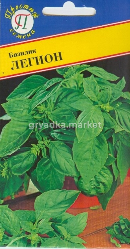 Листовая пластинка от средней до крупной, яйцевидной формы, слабопузырчатая, волнистость края очень слабая, насыщенной зеленой окраски и глянцевым блеском. Благодаря высокому содержанию эфирных масел листья и стебли обладают насыщенным гвоздично-перечный ароматом. Черешки средней длины.Обладает хорошей устойчивостью к краевому ожогу листьев, что особенно важно, при выращивании методом проточной технологии. При выращивании на грунтах к уборке зелени можно приступать при достижении растениями высоты 15-20 см. После срезки зелени растения базилика Легиондовольно быстро отрастают. Зелень сохраняет привлекательный вид после длительной транспортировки