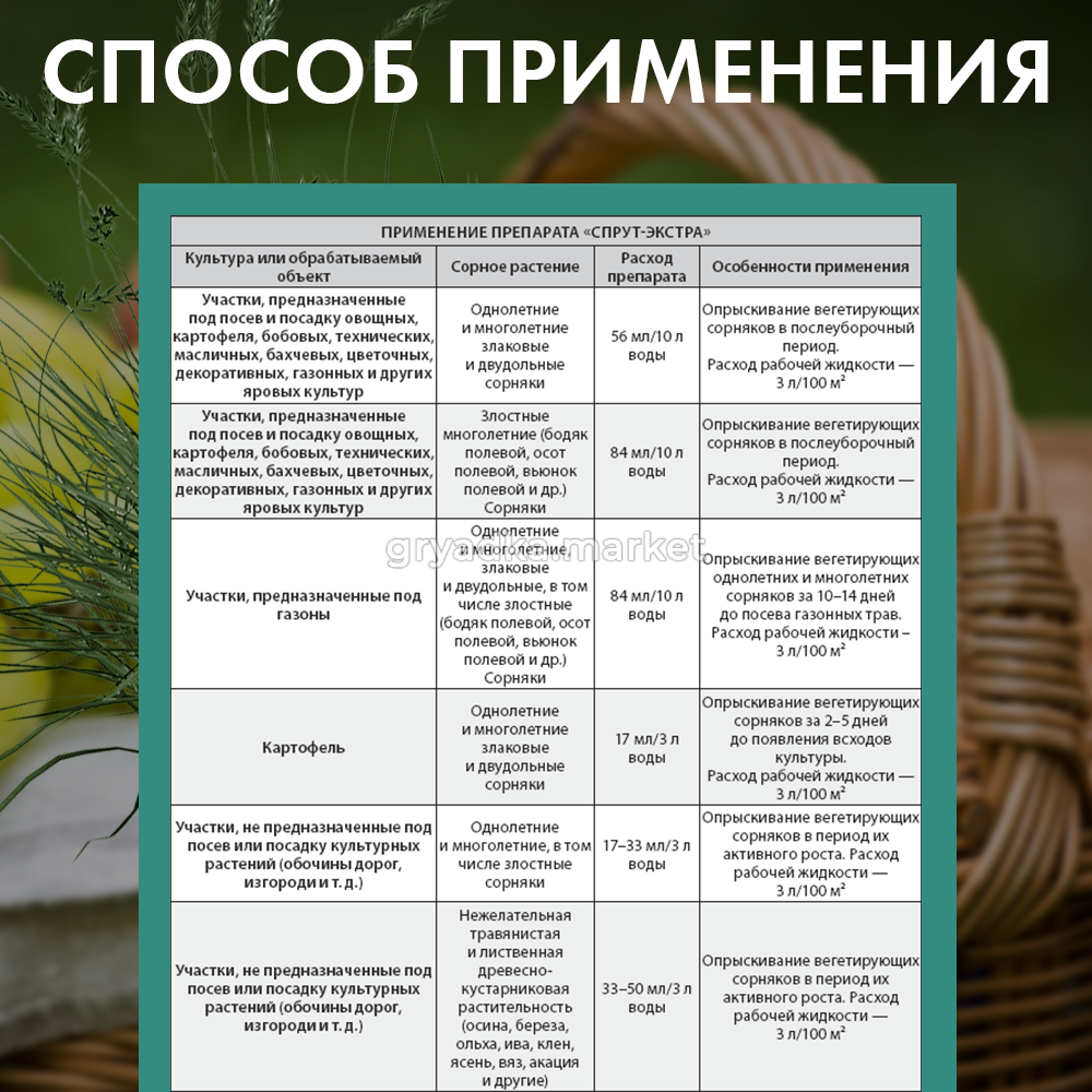 Применение: наибольший эффект достигается при обработке сорной растительности, находящейся в фазе активного роста и при благоприятных условиях (оптимальной влажности и температуре) в период с апреля (мая) по сентябрь.