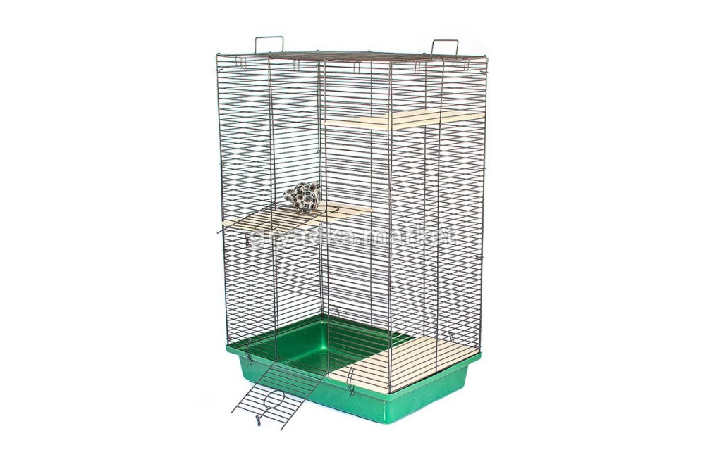 Клетка для шиншилл металлическая на пластиковом поддоне. Разборная конструкция - 4 стенки и крыша. Дверца в передней (длинной) стенке. В комплекте 2 этажа из фанеры, 2 ручки для переноски. Прутья стенок расположены горизонтально. Расстояние между прутьями 13,5мм. Габаритные размеры клетки с поддоном: длина 58см, ширина 40см, высота 84см. Высота поддона 10,5см. Цвет поддона- изумрудный. Цвет прутьев - чёрный. Поставляется в разборном виде (компактная упаковка) в индивидуальной коробке.