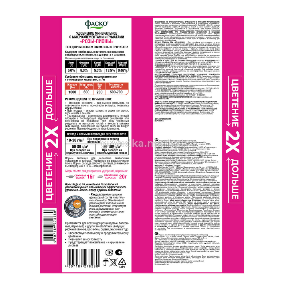 Удобрение минеральное 5М-гранула для роз Глория ФАСКО® произведено по уникальной технологии на российском рынке, обеспечивающей дополнительные преимущества продукции перед традиционными аналогами. Применяется для ухода за многолетними цветочно-декоративными культурами, такими как розы, пионы, сирень, калина, жасмин, ирисы и т.п.